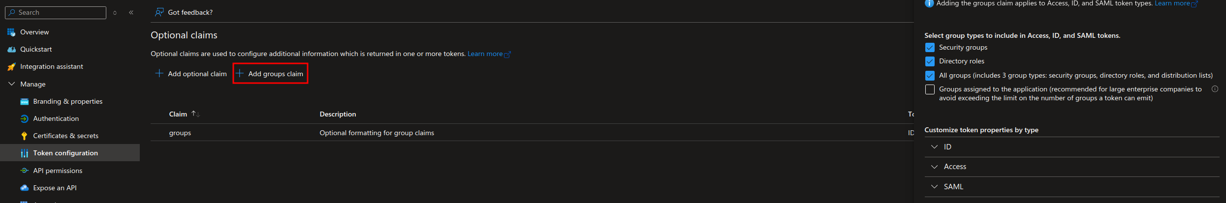 NOTE: If you have a large AD with many groups you can assign specific groups to the App Registration so that only those groups are emitted in the token. MSFT Docs. In that case you should only select the 4th option: