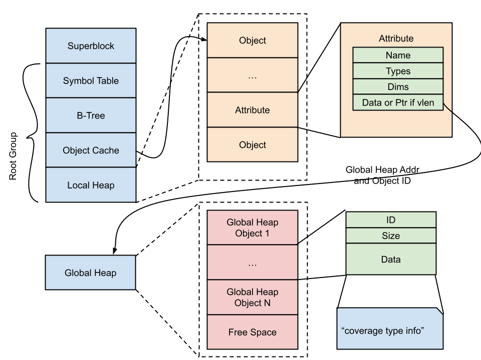 write96 bytes to the Superblock, usually at the beginning of the file (offset 0x0). This write is important, it updates the superblock and the End of File address.write40 bytes to the Symbol Table Cache, this is usually a NOP because no new datasets were createdwrite4096 bytes to the end of the file, creates a new global heap.write120 bytes Updates the attribute pointers to point to the new global heap where the new values now reside.