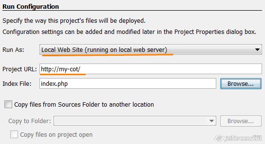 Первое, что надо сделать в IDE, это создать новый проект, который будет отражать код и содержимое нашего тестового сайта (http://my-cot). Выбираем меню File → New Project, выбираем категорию PHP, тип проекта PHP application with existing source (т.е. приложение с уже готовым кодом), жмем Next. В качестве исаходного каталога (Sources folder) выбираем каталог нашего сайта — openserver\domains\localhost\cotonti_test. Имя проекта оставляем cotonti_test (версия PHP 5.3, кодировка UTF8).