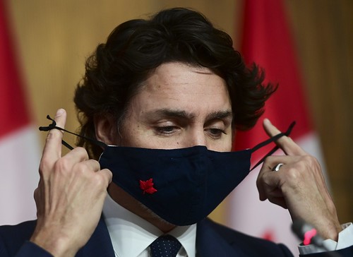 - a shallow-focus photograph of justin trudeau putting on a black cloth mask with an embroidered red maple leaf at an indoor press conference. source