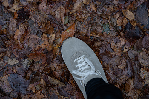 - a closeup top-view photograph of a person's grey-and-white right shoe stepping on wet brown leaves. source