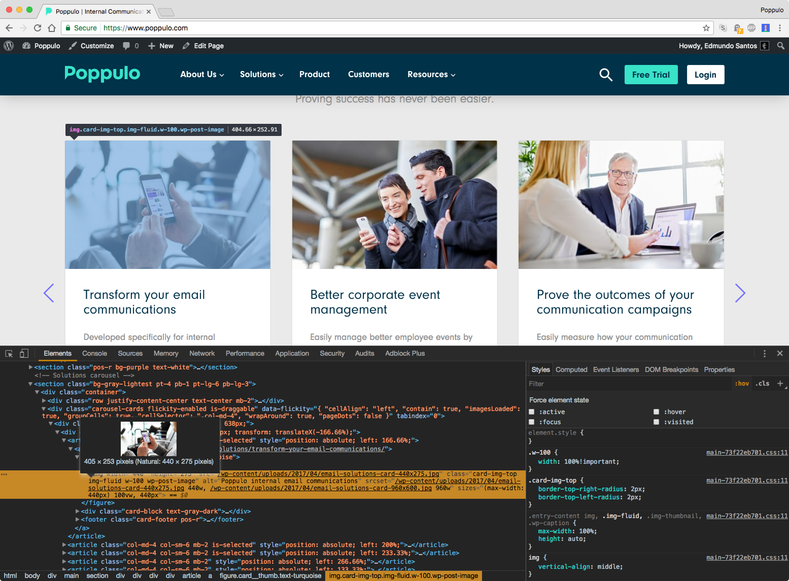 Have a look at the images on the Poppulo landing page. For example the raw image email-solutions-card-[size].jpg has a width of 960px, however I only display it at 960px on a large screen. Also, on a narrow viewport size, for example when the viewport width is at 440px, the image width is constrained to 440px and resized accordingly.