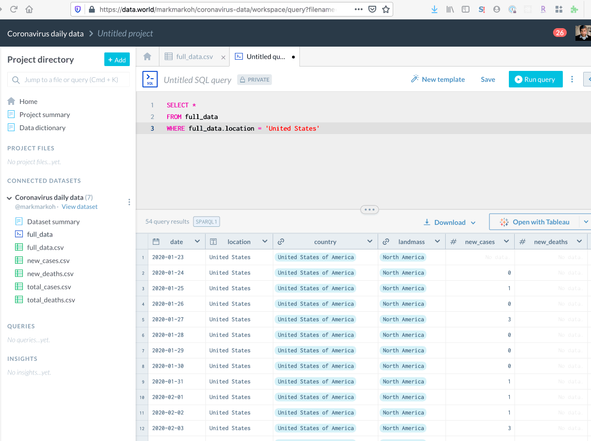 Every file and query on data.world is an API endpoint to be consumed via any language or application. Here are a few common examples: