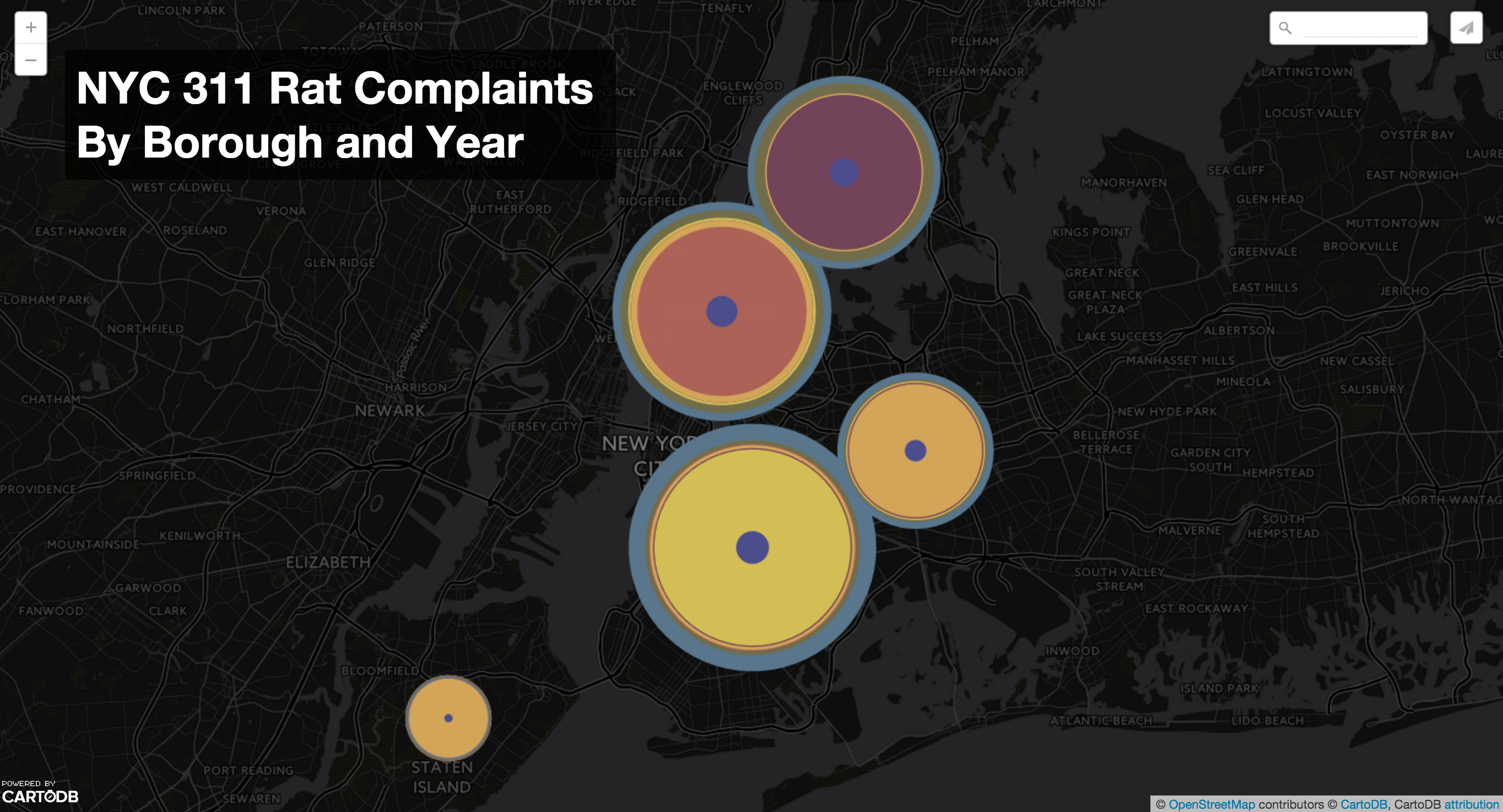 Now we can make a category map off of the year column, and then do a rough proportional symbol map off of the number of complaints. Here's a good styling for that (with help from our colleague Mamata):