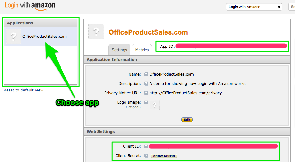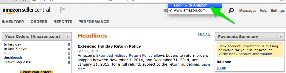 Switch your interface to Login with Amazon by selecting the drop-down button on the top-right edge of the page.