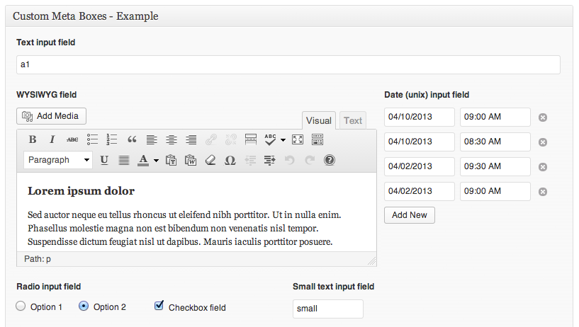 - Filter cmb_meta_boxesto add your own meta boxes. The wiki has more details and example code
