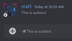 Like Headers, you can add subtext to any chat message. To do so, add a (-# ) before the text you want to appear in the subtext. Don’t forget the space after # and before your message.
