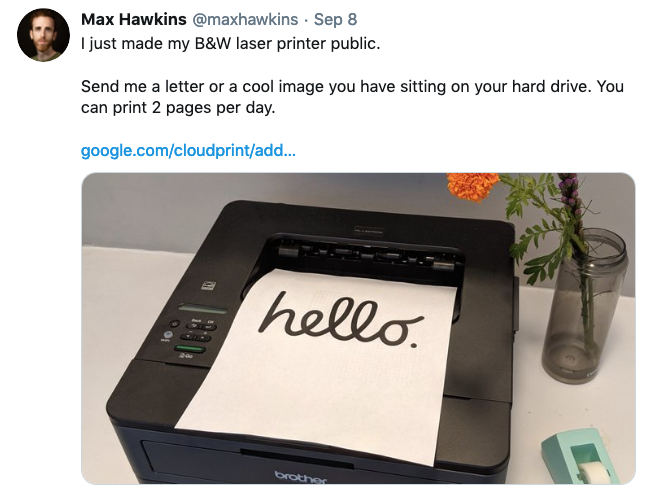This September I decided to share my laser printer so anyone on the internet could send me printed messages.