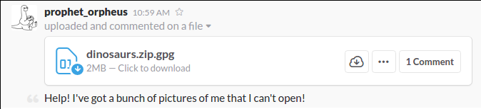 $ gpg -d dinosaurs.zip.gpg > dinosaurs.zipThen unzip it...