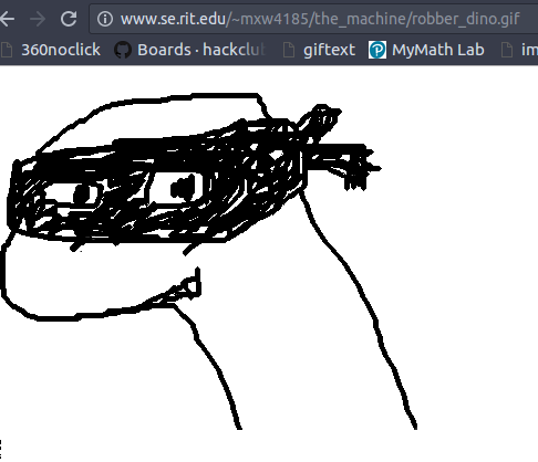 aHR0cDovL3d3dy5zZS5yaXQuZWR1L35teHc0MTg1L3RoZV9tYWNoaW5lL3JvYmJlcl9kaW5vLmdpZg==It's base64 encoded, so after decoding it we get "http://www.se.rit.edu/~mxw4185/the_machine/robber_dino.gif". The image looks like this: