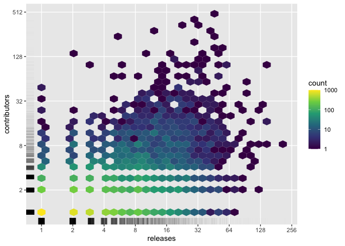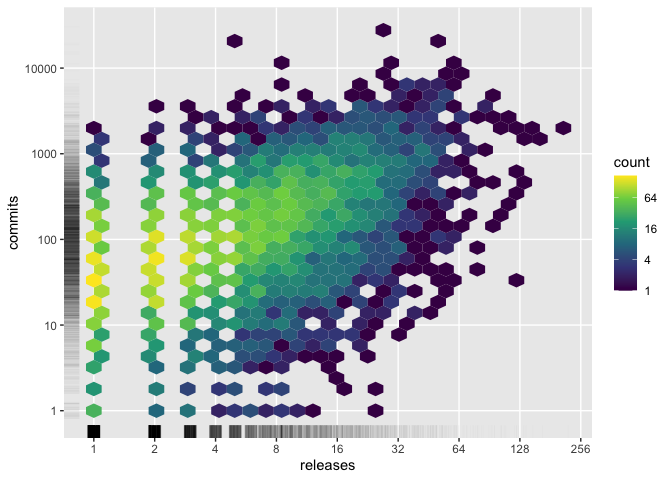 theme(panel.grid.minor = element_blank())ggplot(packages_tidy, aes(x = releases, y = commits)) +