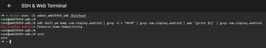 adb shell pm dump com.viaplay.android | grep -A 1 "MAIN" | grep com.viaplay.android | awk '{print $2}' | grep com.viaplay.android