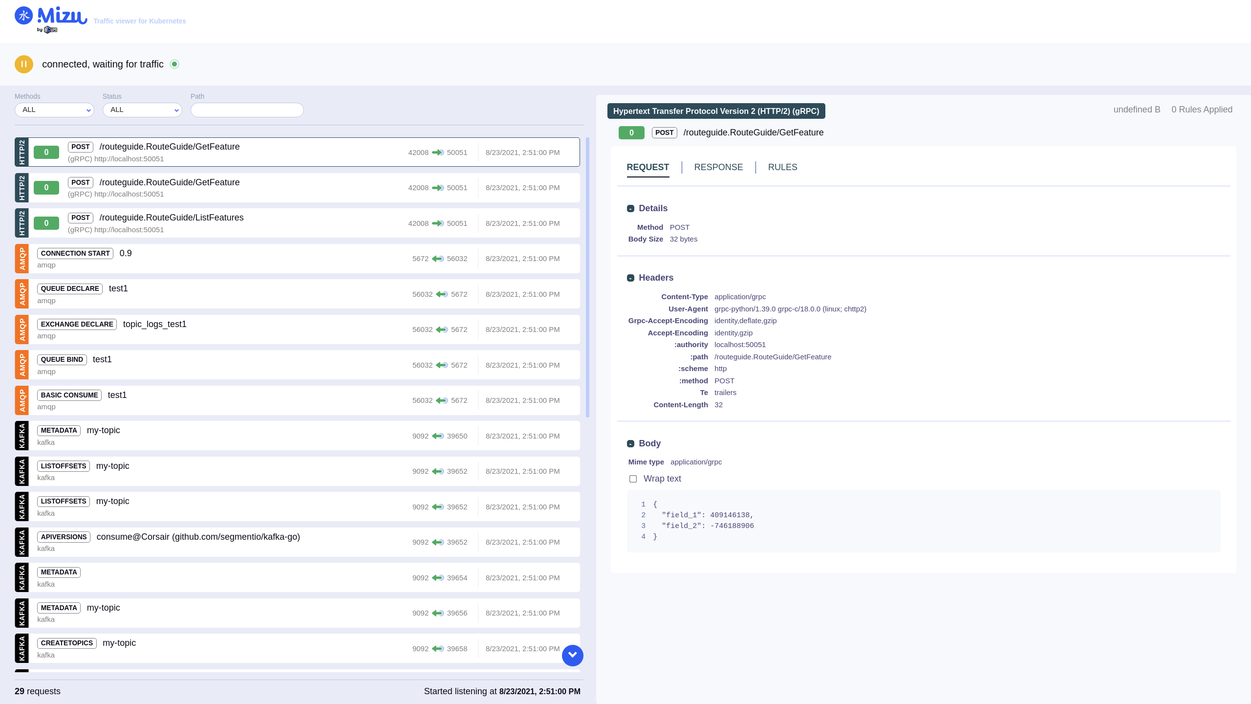 go run list_topics.go &These Go and Python programs will generate the traffic for the protocols: HTTP, gRPC, AMQP, Kafka