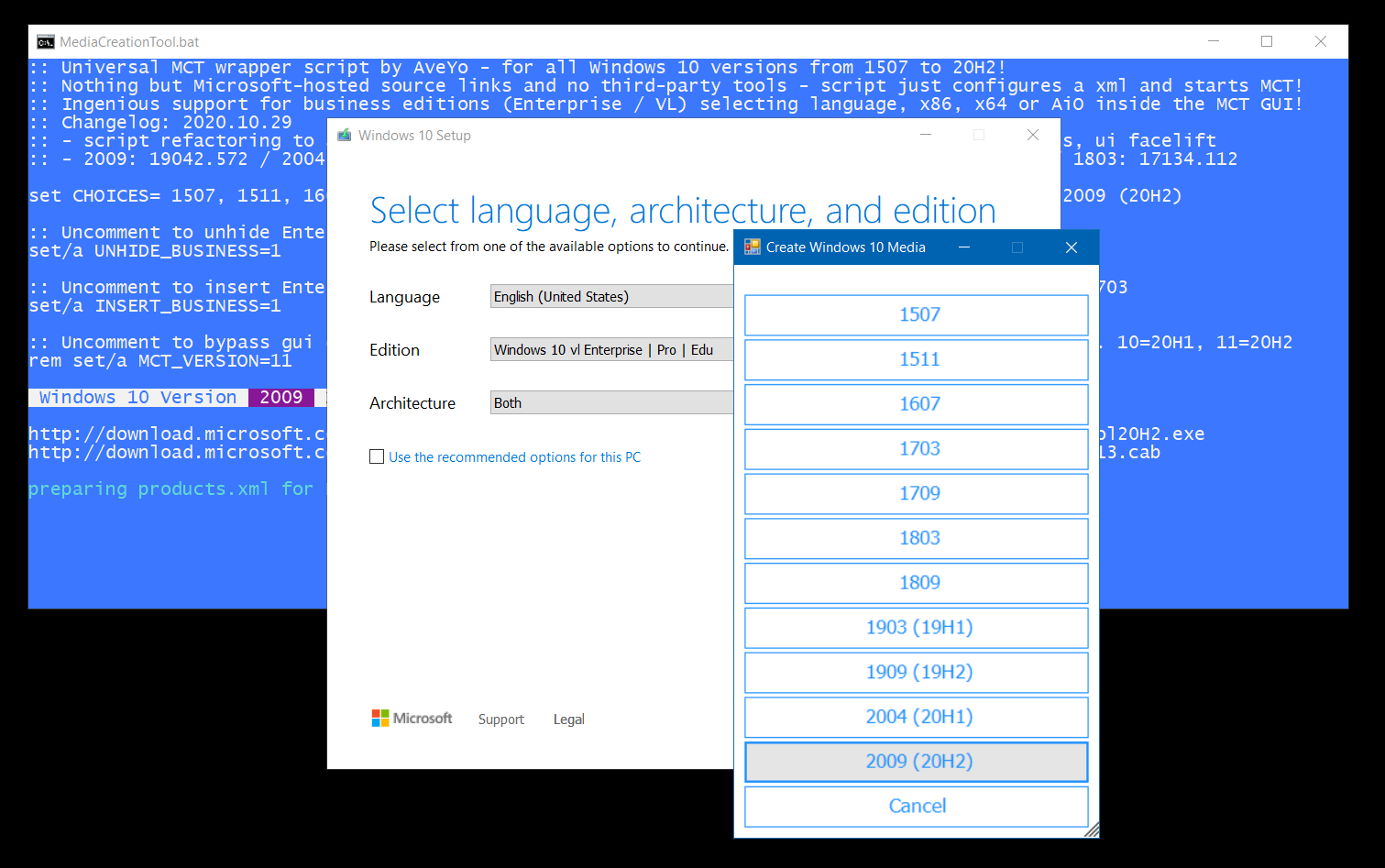 Universal MediaCreationTool wrapper for all MCT Windows 10 versions from 1507 to 20H2 with business (Enterprise) edition support