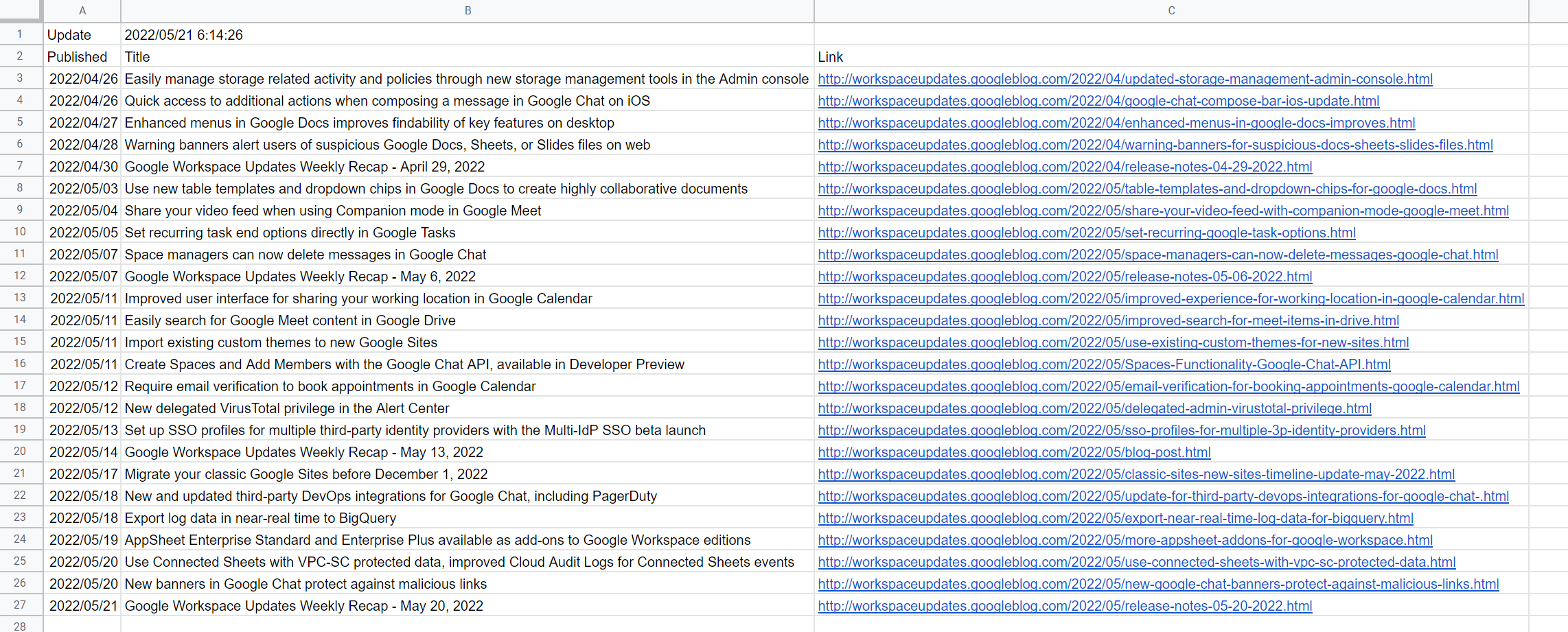 Retrieving and Parsing XML data from Google Workspace Update Blog and Putting it to Google Spreadsheet using Google Apps Script