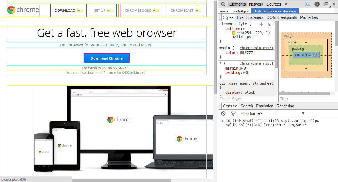 A tweet-sized debugger for visualizing your CSS layouts. Gives every DOM element on your page a random (valid) CSS hex color.