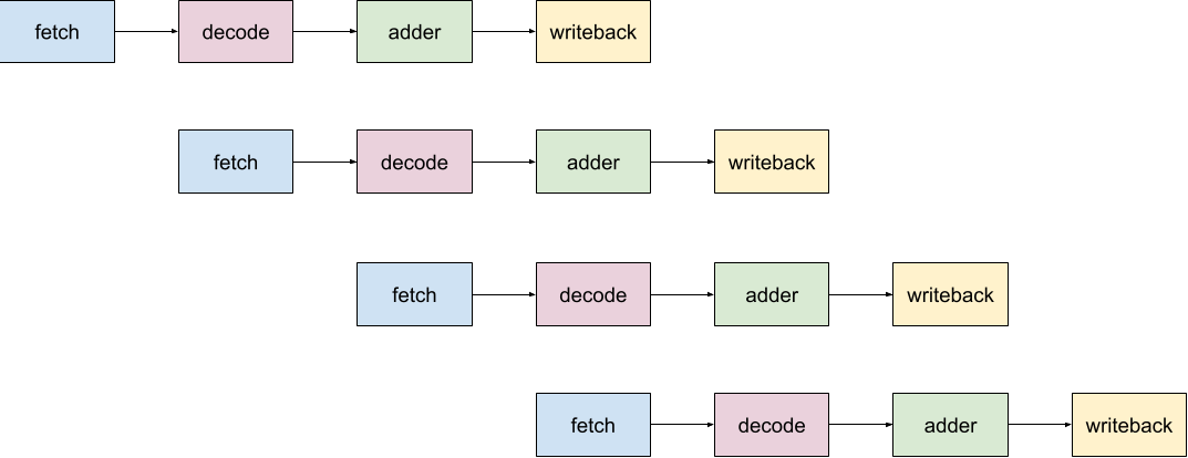 In this flow, the processor "focuses" on each instruction in turn, fully completing its execution before moving on to the next one, and requiring sixteen full cycles to evaluate four instructions. However, as mentioned earlier, the decoder (for example) doesn't really need to wait for the current instruction to complete before starting to decode the next one. In fact, all four of these instructions are entirely independent, which means that the processor can safely squish it all together and keep each hardware unit fully utilized during each stage of the evaluation: