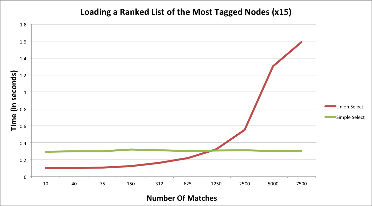 To see how these two techniques stack up, I created different quantities of Drupal nodes with a randomly selected tag. For instance, I created 10 nodes with the tag 123, 40 nodes with the tag 456, 75 nodes with the tag 789 and so on. Then I searched for nodes which have that tag using the two queries described above. While Union Select performed better for tags with few corresponding nodes, Simple Select performed better for any tag that was used more that 1,000 times. Note, these bench marks are how long it took to run each query 15 times, unlike the other bench marks in this document.