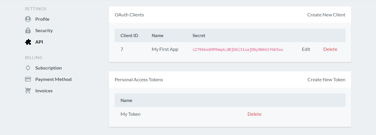 After registering the components, make sure to run npm run dev to recompile your assets. Once you have recompiled your assets, you may drop the components into one of your application's templates to get started creating clients and personal access tokens: