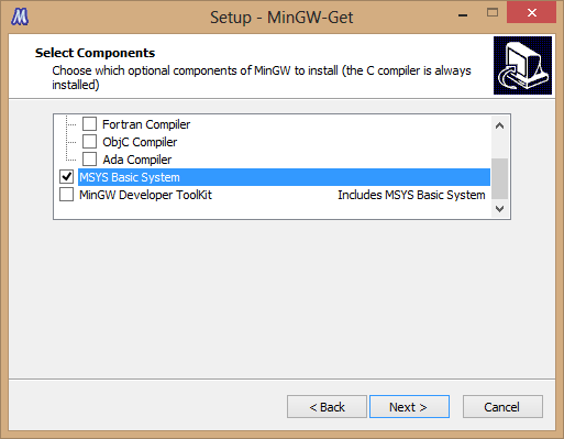 When asked to select which components to install, deselect the MinGW Compiler Suite (unless you want to do C and C++ work with gcc). This can also be installed later if you would like. Scroll down and select the "MSYS Basic System" option.