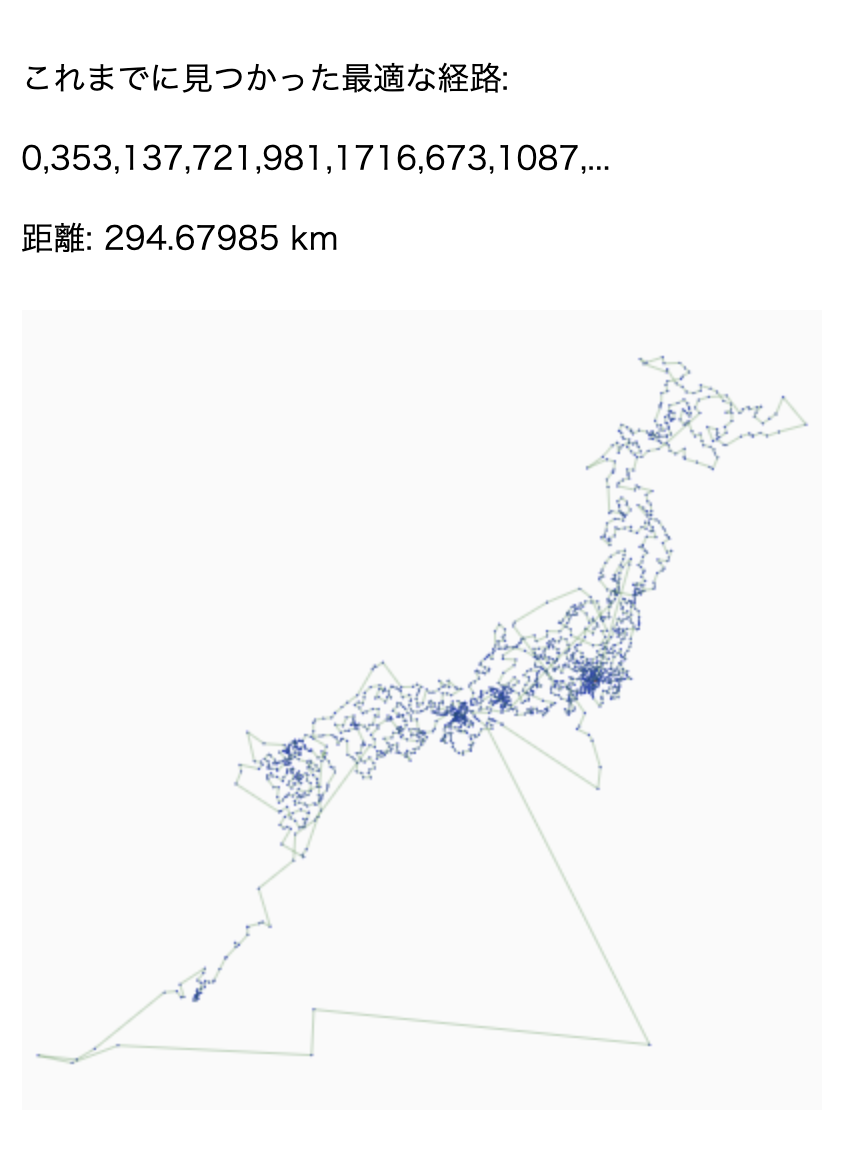 今のところ「294.67985 km」が最短です。 https://i.gyazo.com/4782085a01fa699093d84192f1b27c0b.png