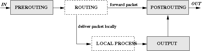 - Incoming packets destined to another host: PREROUTING -> FORWARD -> POSTROUTING.