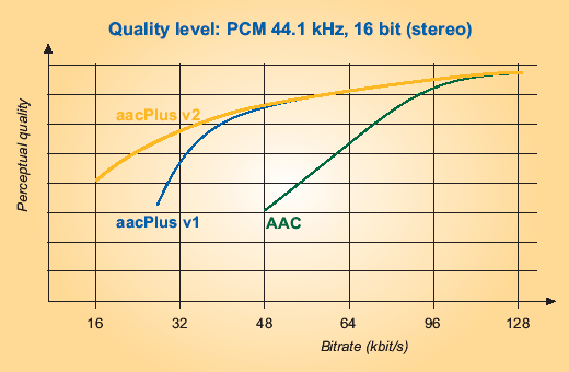 This is a pair of AAC profiles tailored for low bit rates (version 1 and version 2). HE-AAC version 1 is suited for bit rates below 64kb/s (for stereo audio) down to about 48 kb/s, while HE-AAC version 2 is suited for bit rates as low as 32 kb/s (again, for stereo).