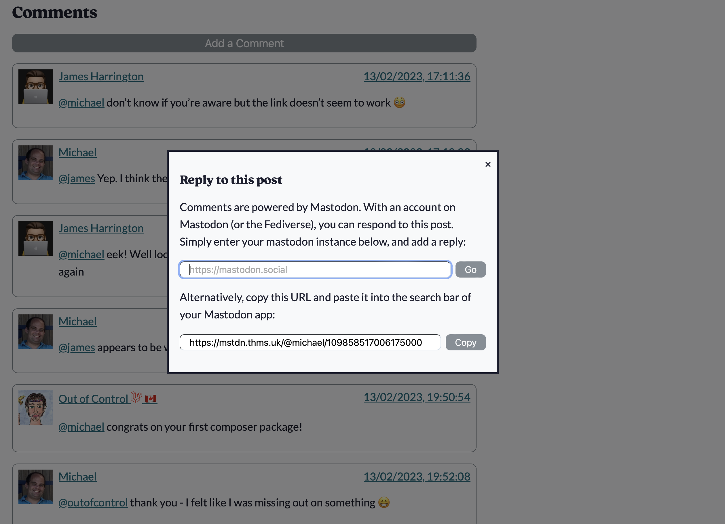 - As much as I'd like to think that my blog posts are so engaging people will sign up to Mastodon in droves just to be able to comment on my posts, that's obviously not happening, so essentially you'll only get comments from existing Fediverse users.