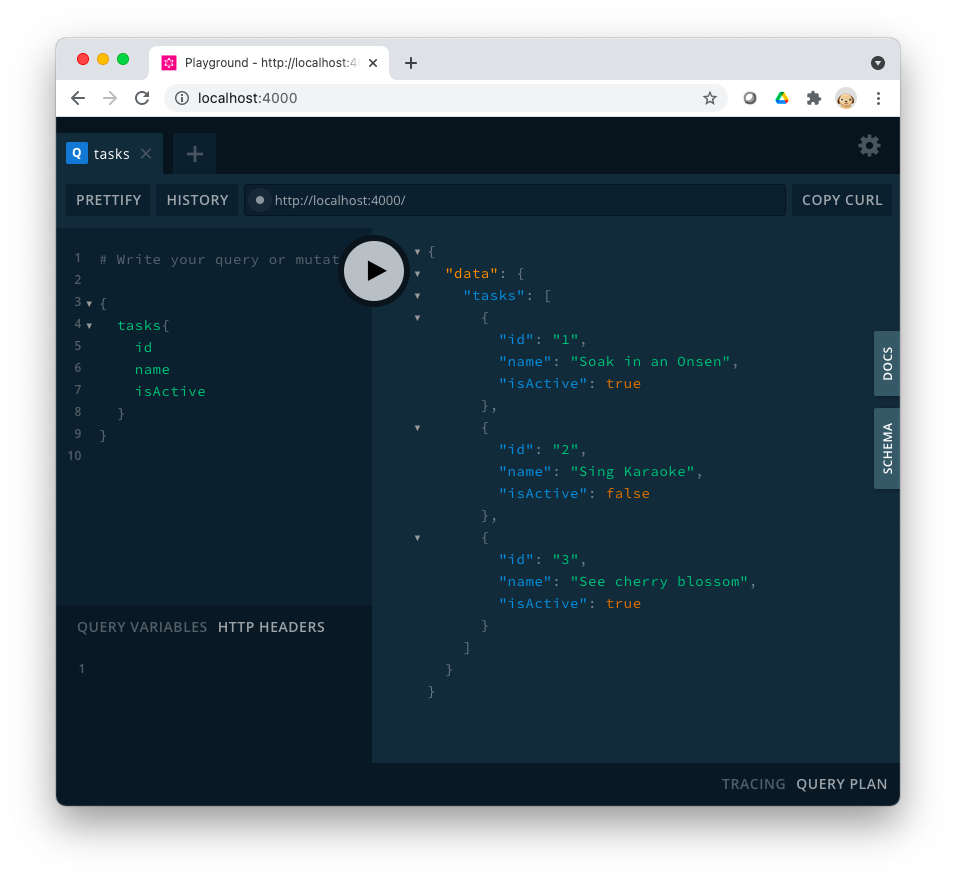 ๐ Server ready at http://localhost:4000/Let's try throwing a query to display a list of todo, as shown in Query, which is a simple query that returns the contents of the tasks array.