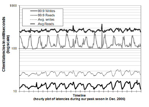 この論文ではこの分布の99.9パーセンタイルがたくさん参照されますが、これはAmazonエンジニアの顧客体験の観点からのパフォーマンスへの飽くなきフォーカスを反映しています。世間の論文では平均値ばかり取り上げられますが、Amazonのエンジニアリング/最適化は平均値には注目しません。writeコーディネーターの負荷分散など、いくつかの技術は純粋に99.9パーセンタイルのパフォーマンスの制御がターゲットです。