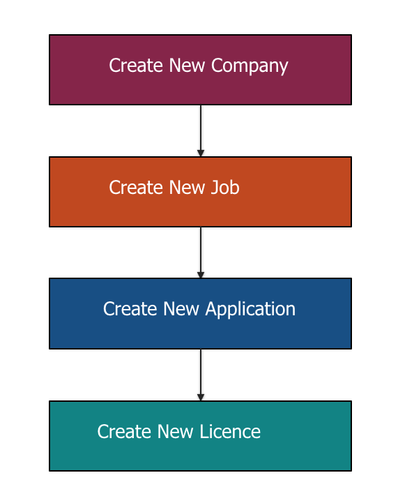 Khi bạn thành lập 1 và phát triển công ty phần mềm thì công việc đầu tiên tất nhiên sẽ là THÀNH LẬP CÔNG TY. Sau khi thành lập công ty thì chúng ta cần có nhân viên thế nên là chúng ta TẠO RA CÁC VỊ TRÍ CÔNG VIỆC để tuyển. Sau khi tuyển được người thì công việc sẽ là XÂY DỰNG ỨNG DỤNG và để 1 ứng dụng được chạy hợp pháp thì tất nhiên bạn sẽ phải ĐĂNG KÝ GIẤY PHÉP với nhà nước.