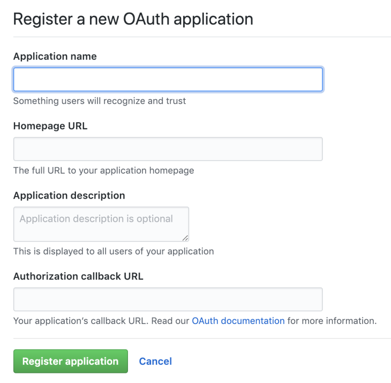 - Github에서 OAuth App이라는 것을 만들고 몇가지 준비를 해야한다. 깃허브 계정이 있다면 로그인 후 해당링크에서 아래 단계를 수행할 수 있다.