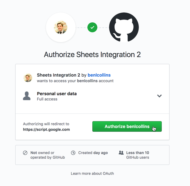 이런 페이지를 마주하게 되는데 초록색 버튼을 누르면 내 Github계정을 우리가 만든 앱에서 사용가능하도록 하가하게 된다. 그럼 자동으로 callback URL 에 설정한 주소로 사용자를 리다이렉트 시키는데, 이때 Github API 요청에 사용할 토큰을 받는데 사용할 정보를 쿼리스트링으로 만들어서 같이 넘긴다. 다만 이 단계에서는 아무것도 일어나지 않는다. 아직 아무런 설정을 해주지 않았으니 말이다. 다음으로 넘어가보자.