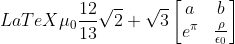 $$ LaTeX \mu_0 \frac{12}{13} \sqrt{2}+\sqrt{3} \left[\begin{matrix}a & b\e^{\pi} & \frac{ρ}{ε_{0}}\end{matrix}\right]