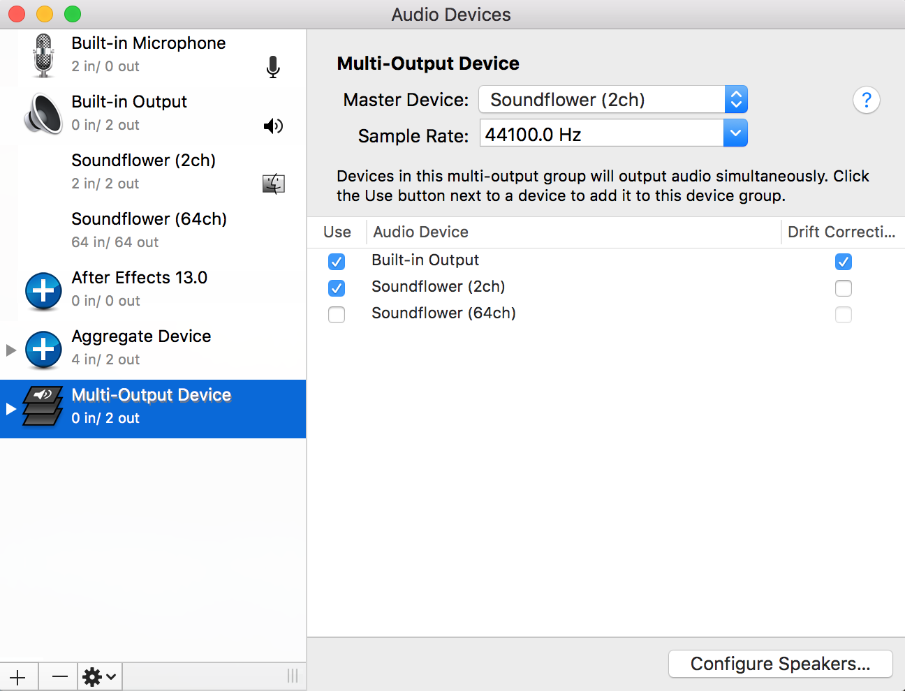 - Click the '+' button in the bottom left corner and select "Create Multi Output Device" in the the panel that appears on the right. Select "Built-in Output" AND "Soundflower (2ch)", then click on the gear icon at the bottom left and select "use this device for sound output". You should now be hearing output audio normally (but it will also be cloned onto the virtual mic).