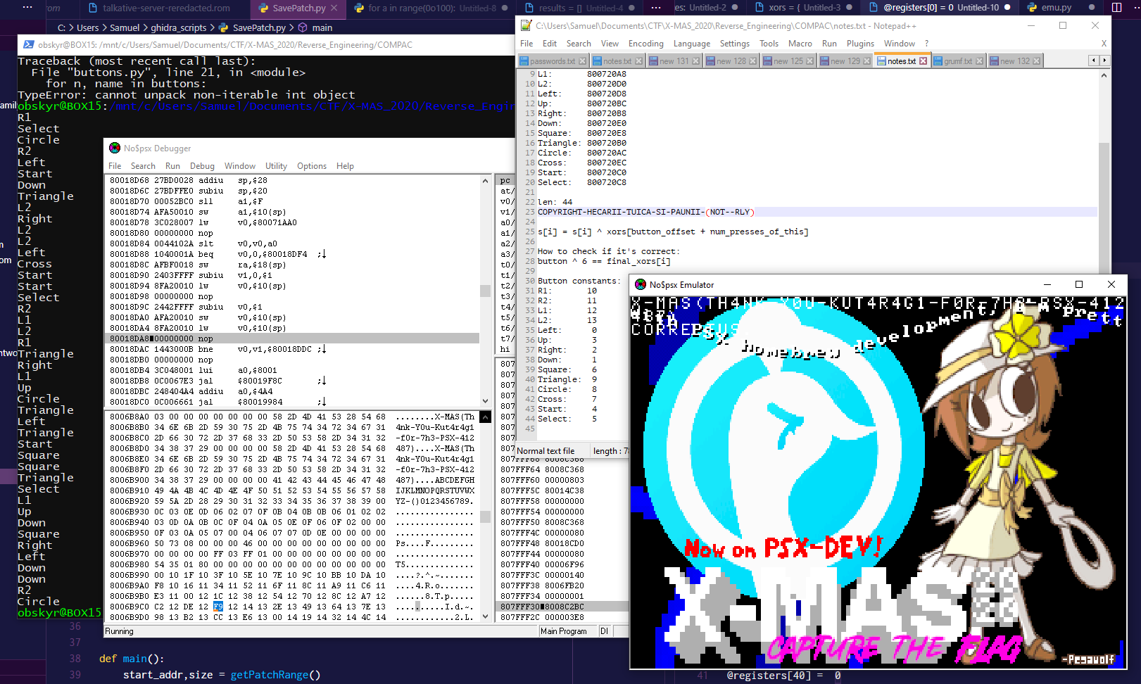 X-MAS CTF 2020 was my first CTF – I do ROM hacking, fan translation, and hardware modding, but I haven't done much hacking related to modern systems, so I was a wee bit worried there wouldn't be many challenges suited to my skillset. Imagine my surprise and delight, then, when I saw the challenge Ken Kutaragi's Secret Code, which consists of a PlayStation executable! And wouldn't you know it? I've hacked away at quite a few PS1 games in my day! Not many people solved it, likely because it requires quite niche skills – so let me share those with you!