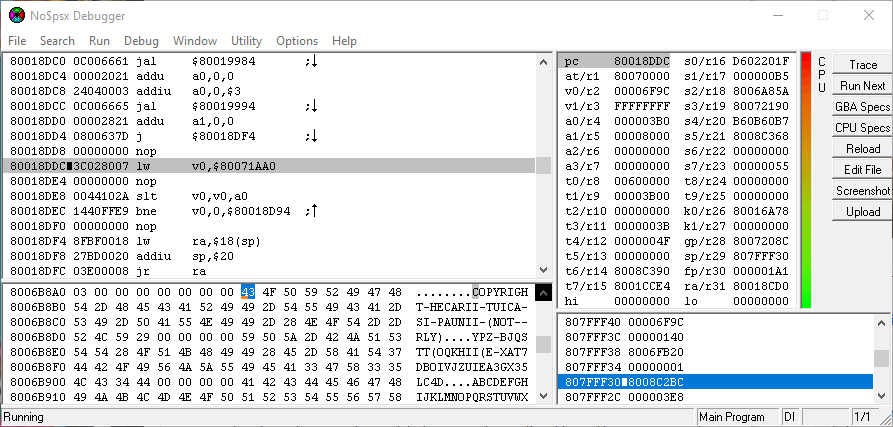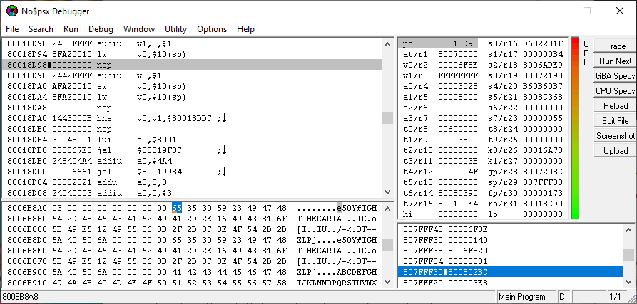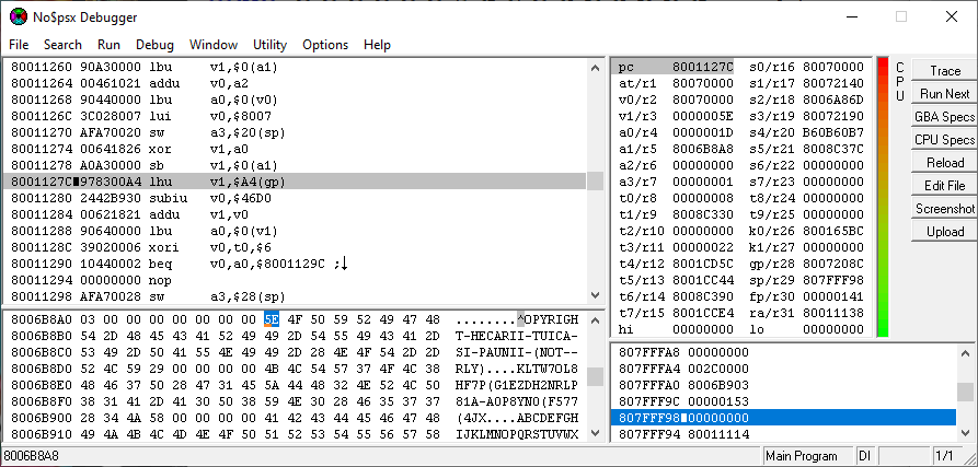“Main RAM” sounds about right! Ctrl+G in the memory view of the debugger, go to 80000000, click “Utility” → “Binarydump to .bin file”, 2048 KiB is 0x200000 so let's enter that as the number of bytes to dump; save that somewhere… And wouldn't you know it? Searching through that in a hex editor – in old games it's far from a guarantee that the text is encoded in ASCII, but it seems to be the case here – it's revealed that at 0x6B8A8, we find the string we're decrypting! That's 0x8006B8A8 in the RAM, and indeed, in the bottom left memory view section of the debugger: