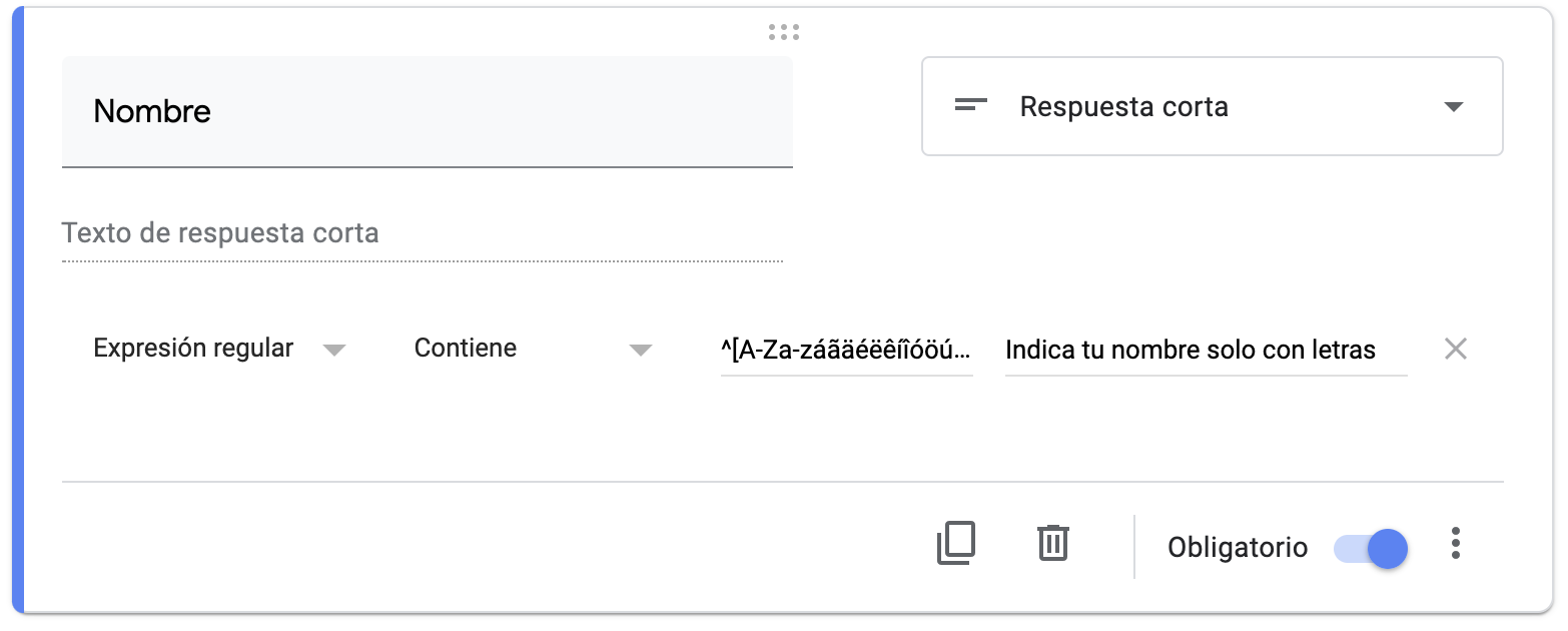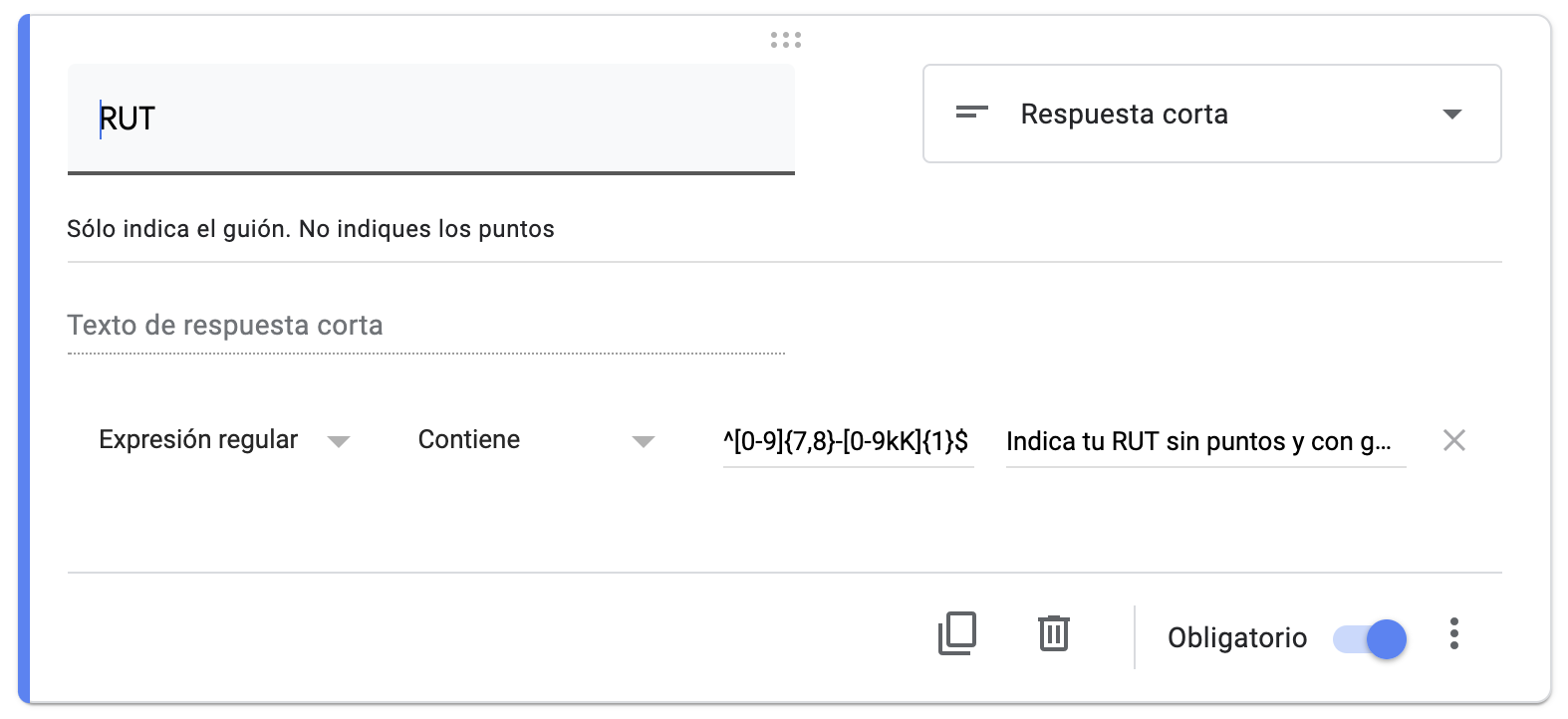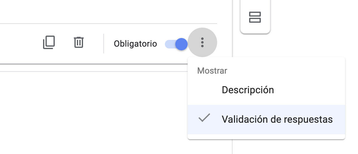 Para usarlas en un Google Form activa la Validación de Respuestas en el menú de 3 puntos al final de la pregunta que estás creando.
