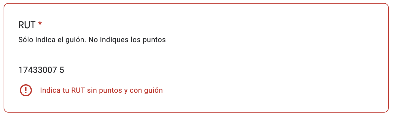 En Chile el número de identificación se llama RUT. Tiene siete u ocho dígitos del 0 a 9, seguidos de un guión y el “dígito verificador” que también es del 0 a 9 o una letra K. Un formato válido de RUT puede ser 17433007-5 o 9322955-K.