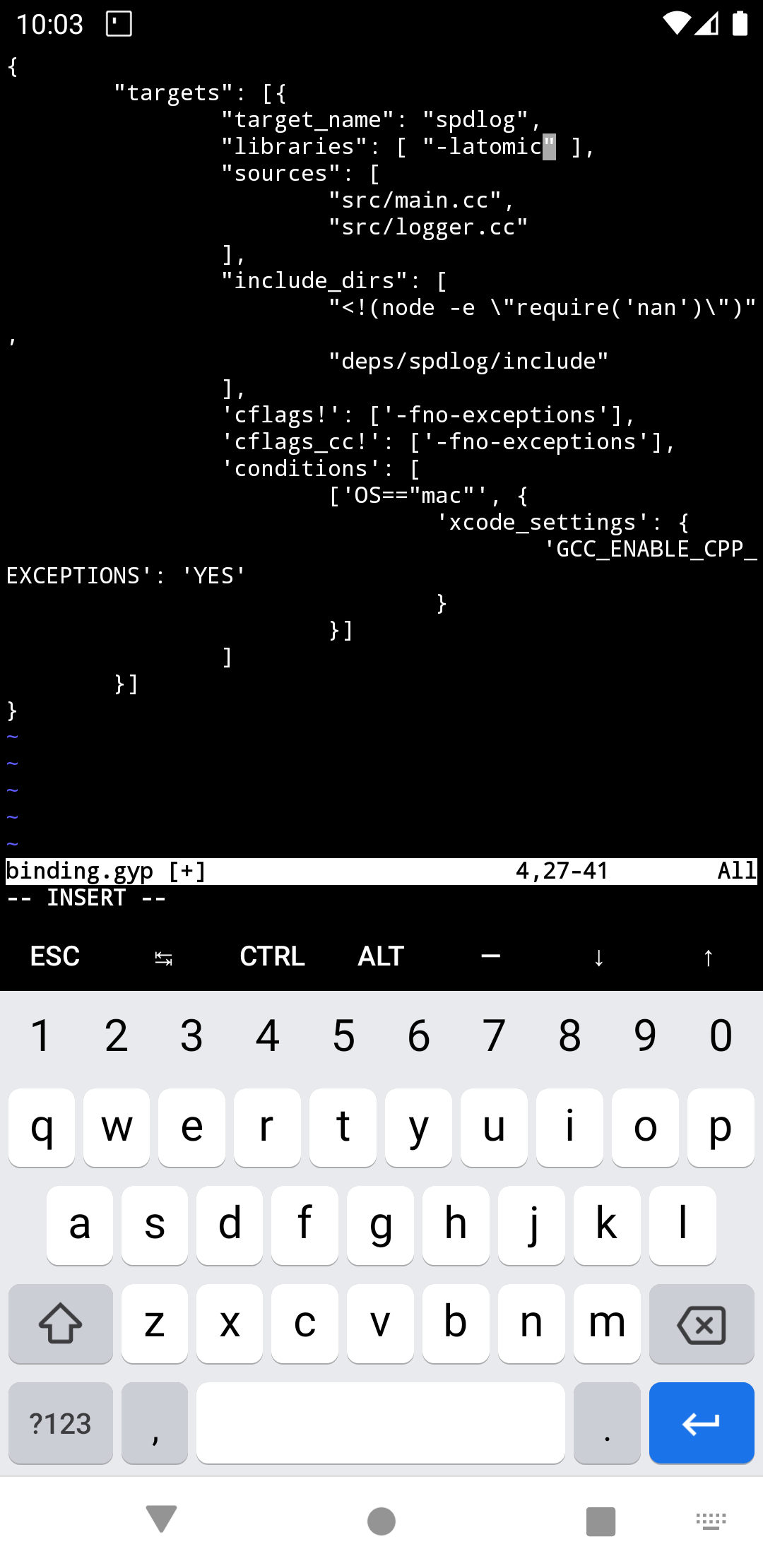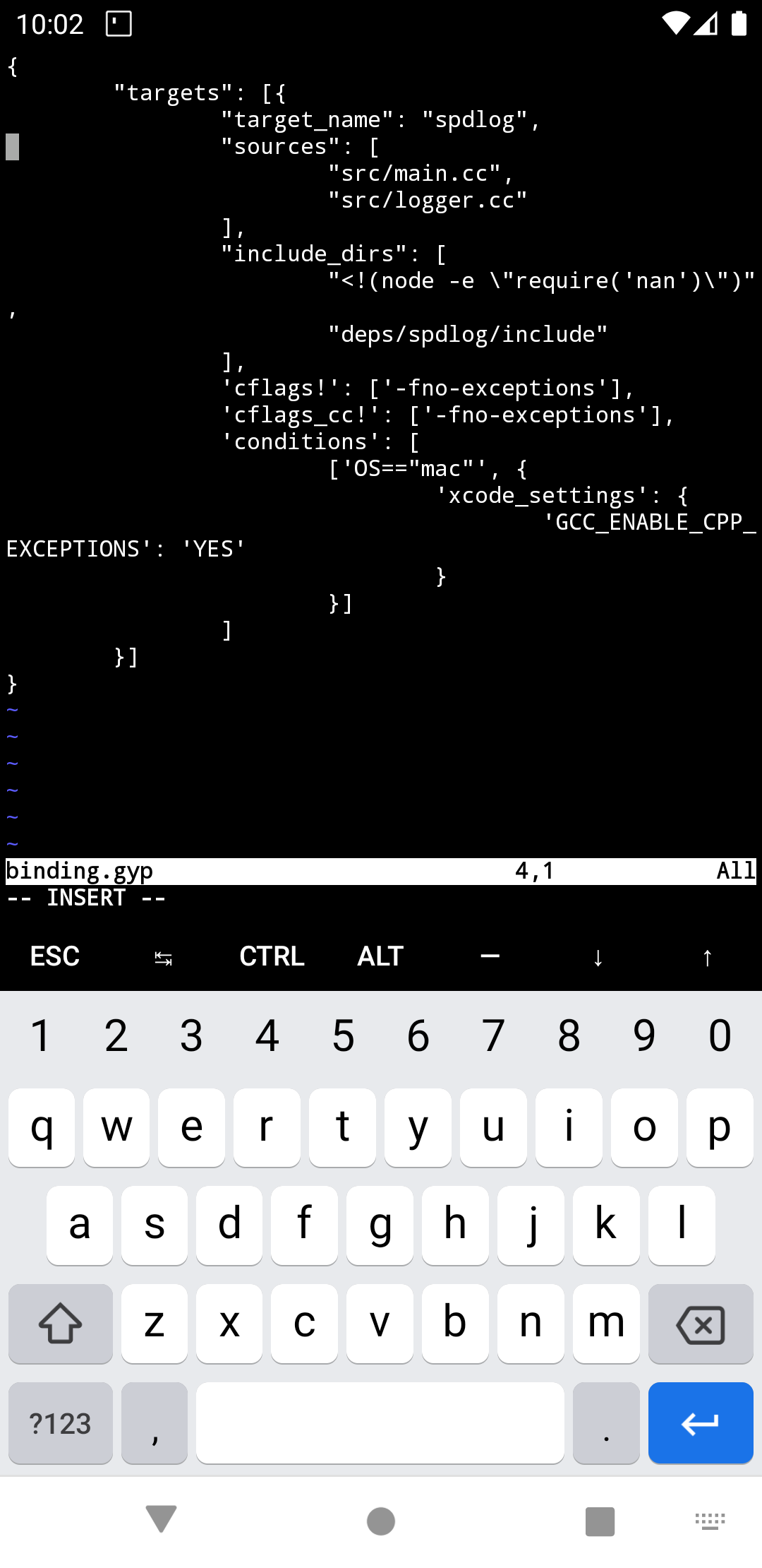 binding.gypand enter edit mode. You can do this by pressingionce you open the file using Vim:$ vim binding.gyp