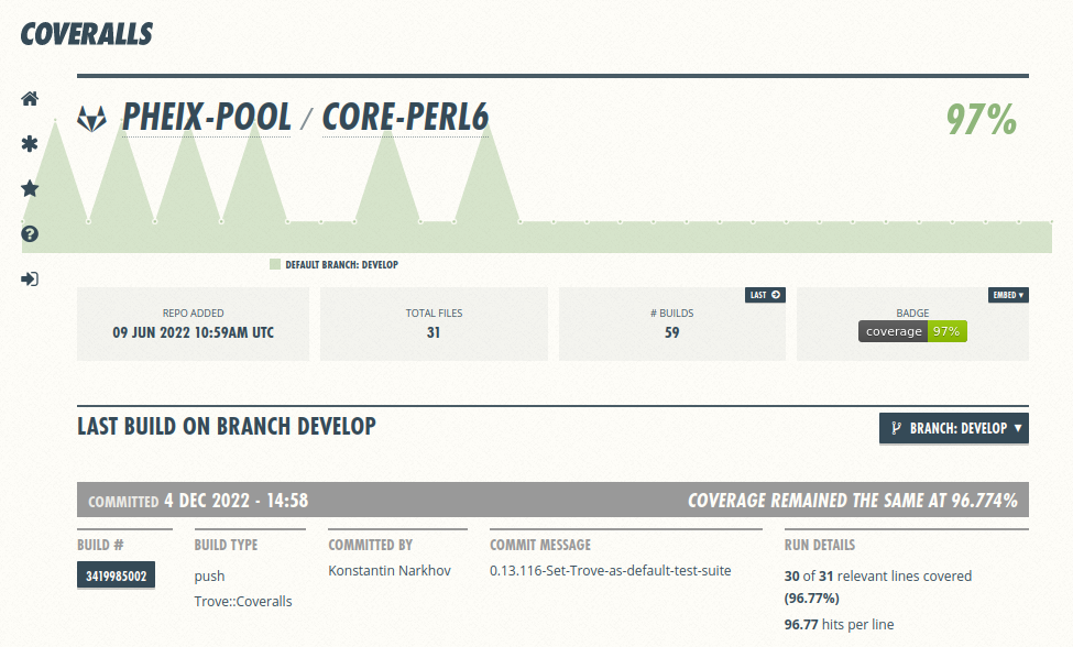 trove-cli --f=/tmp/custom.jq.conf [email protected]:pheix/net-ethereum-perl6.gitIt might be handy to display more details about your project at Coveralls service.