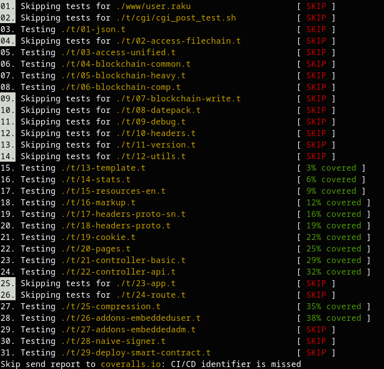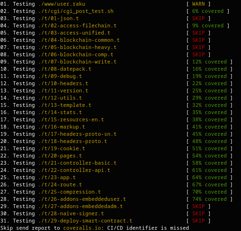Tests became a bit complicated and environment dependent. For example off chain testing like trivial prove6 -Ilib ./t should skip any Ethereum tests including some API units, but not API template engine or cross module API communications. So I had to create environment dependent configurations and since that point I started yet another Pheix friendly test system.