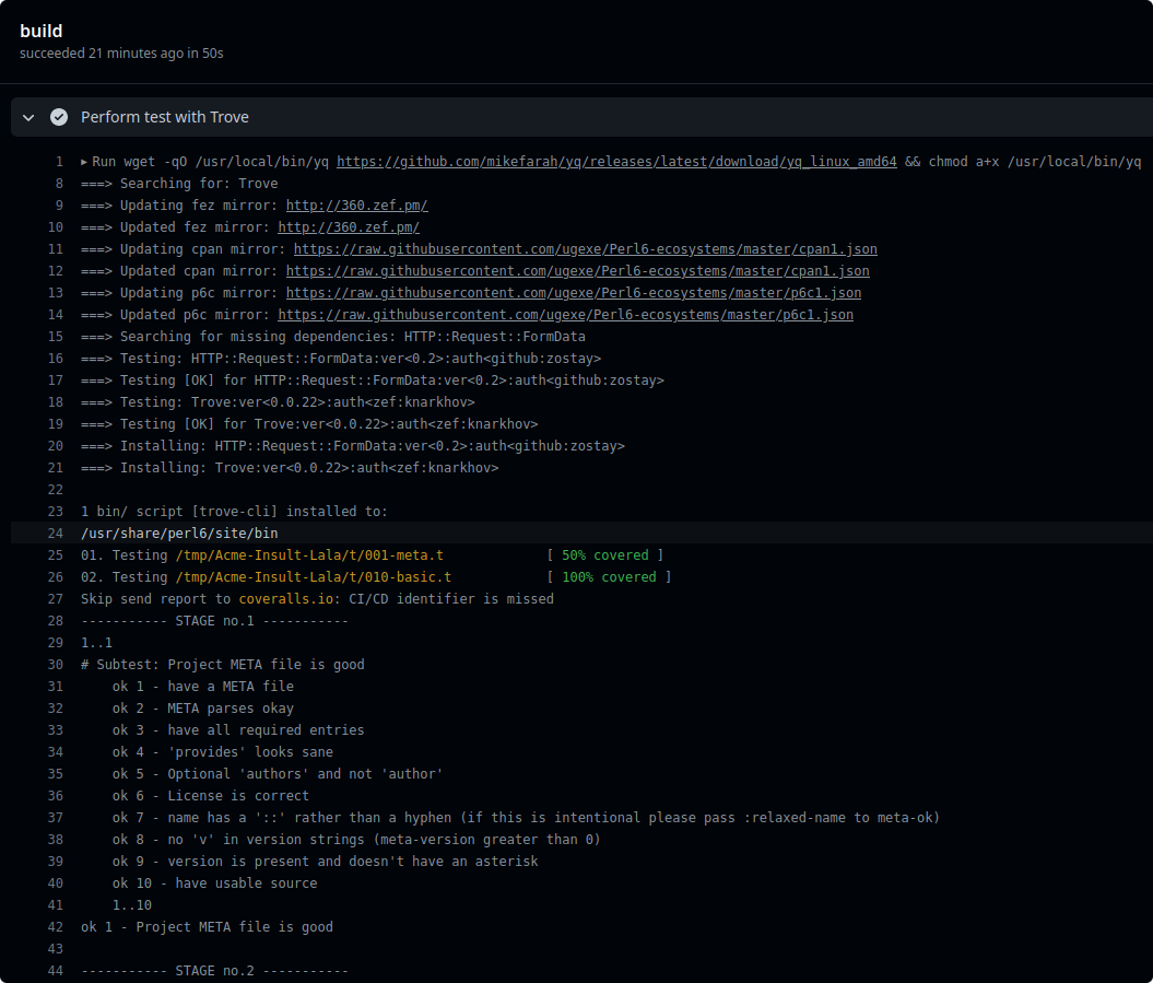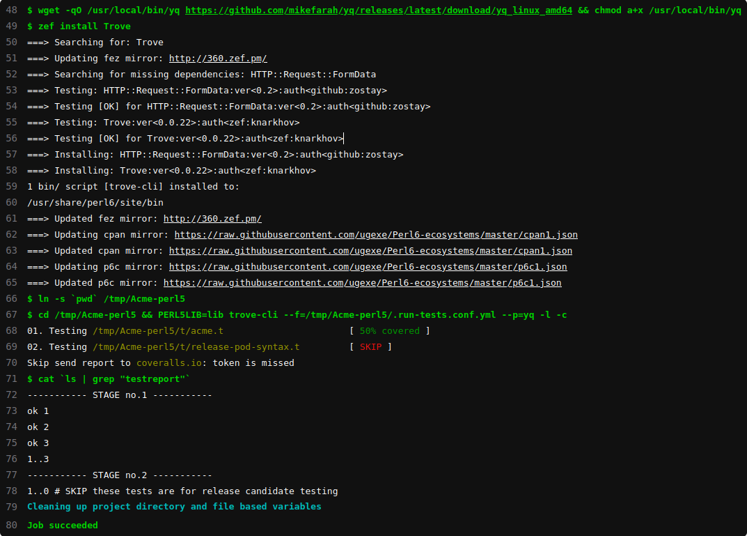 wget ...— manualyqbinary installation;zef install Trove— installTrovetest tool;ln -s ...— creating the module path consistent with.run-tests.conf.yml;cd /tmp/Acme-Insult-Lala && ...— run the tests;cat ...— print test log.