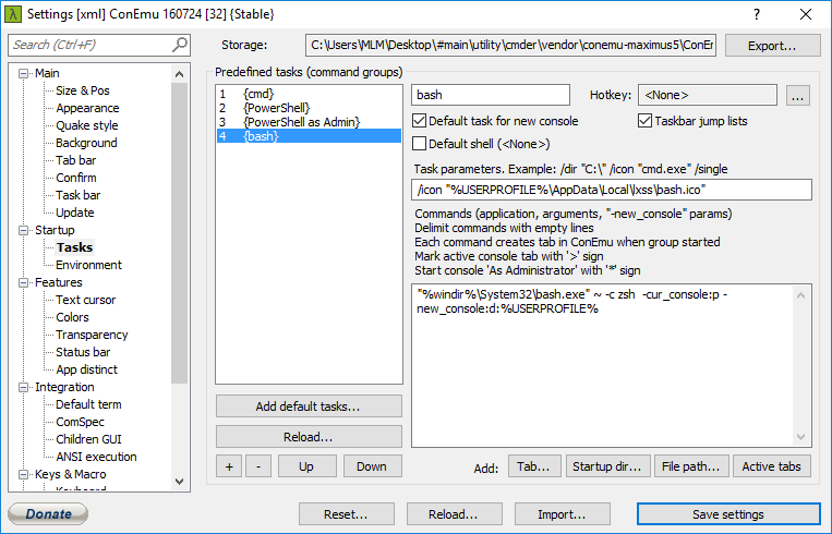 "%windir%\System32\bash.exe" ~ -c zsh -cur_console:p -new_console:d:%USERPROFILE%