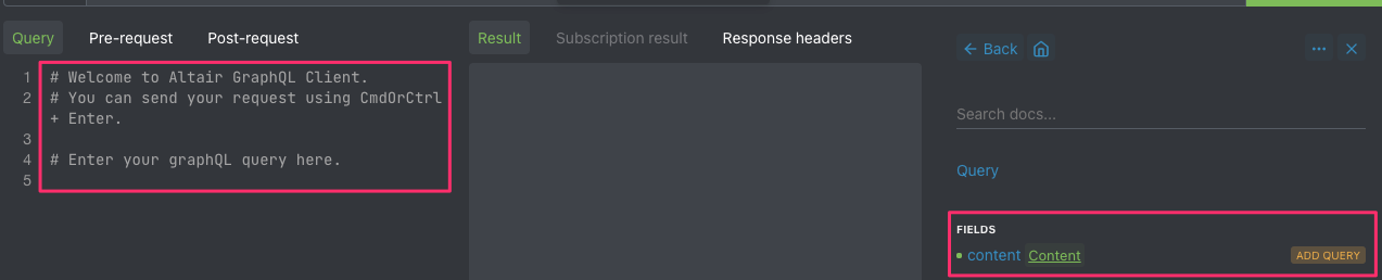Tip: If you get errors when sending a request saying that a field requires subfields, put your cursor on the specific field in the query and hit Ctrl+Shift+Enter to auto populate the type.