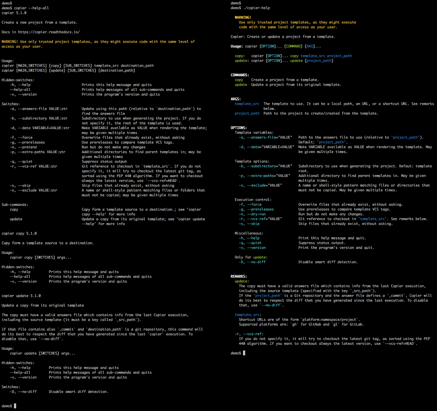 | \e[1;37mUsage:\e[0m copier [\e[36mOPTION\e[0m]... [\e[32mCOMMAND\e[0m] [\e[34mARG\e[0m]... | |
