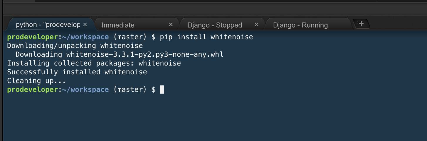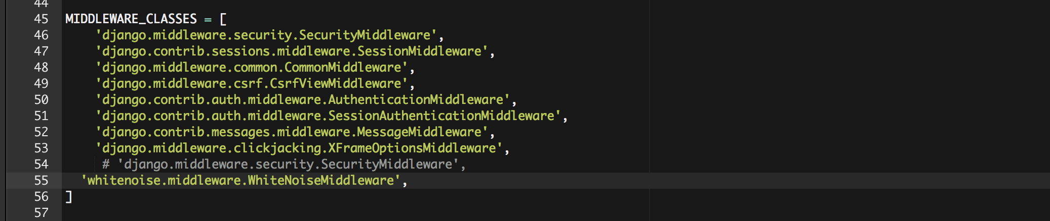 Now to your settings.py file on the MIDDLEWARE_CLASSES list. Add whitenoise as follows
