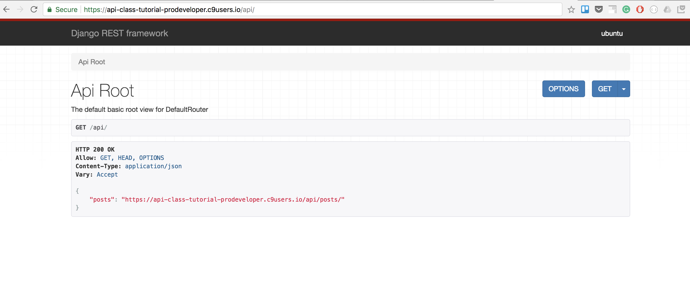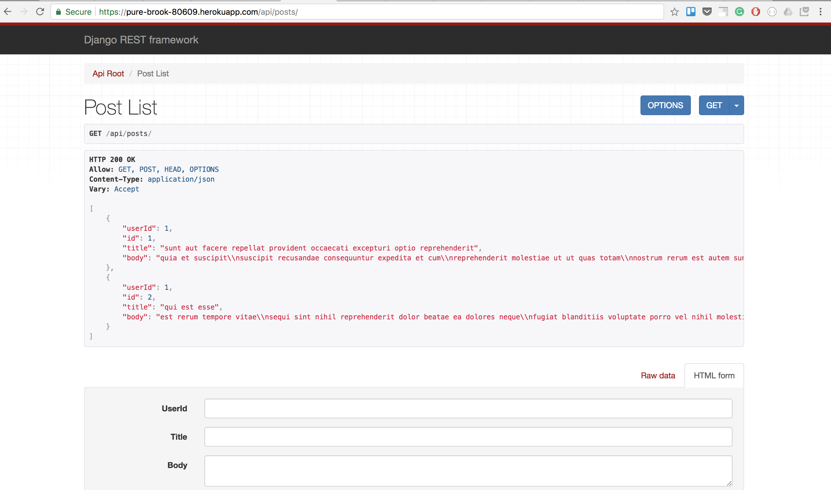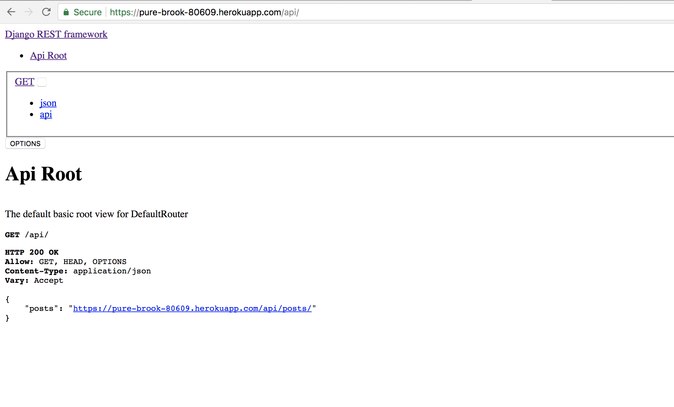 Now push the app to heroku and navigate to the link. Once you have added the host to your settings.py file, you should be in a position to see your endpoint /api
