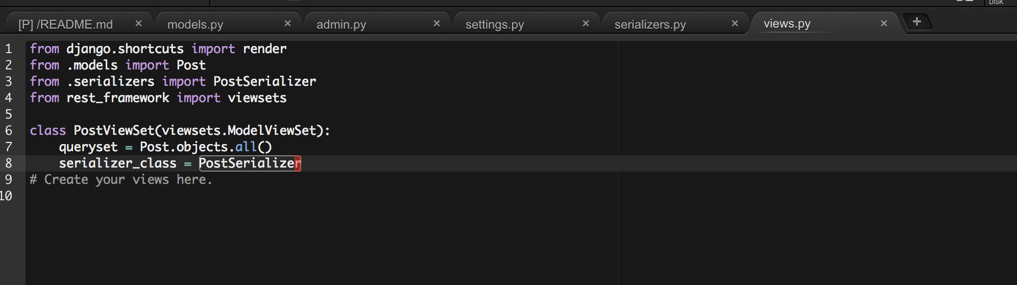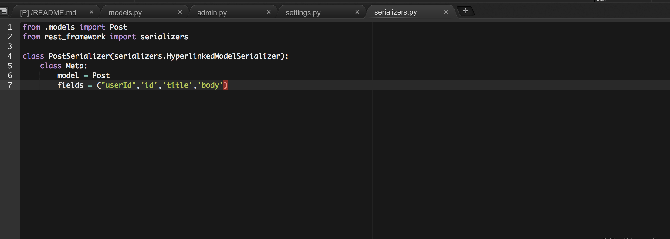 Once that is done, go ahead and create the serializer for the Post model as follows.