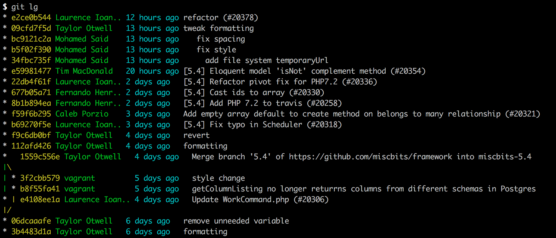 | git config --global alias.lg '!git -c color.ui=always log --pretty=format:"%C(yellow)%h%Creset %C(green)%<(15,trunc)%an%Creset %C(cyan)%<(12,trunc)%ar%Creset %s" --graph -n20' |